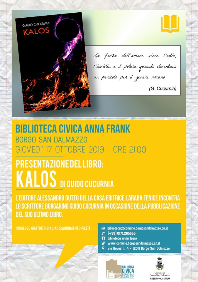 Giovedì 17 ottobre presso la biblioteca Anna Frank di Borgo San Dalmazzo si terrà la presentazione del libro di Guido Cucurnia "Kalos"