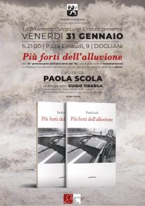 Venerdì 31 gennaio alle ore 21, presso la biblioteca Luigi Einaudi di Dogliani, si svolgerà la presentazione del nuovo libro di Paola Scola “Più forti dell’alluvione” dedicato al terribile disastro ambientale che il 5-6 novembre ’94, annientò parte del Basso Piemonte e provocò nella sola provincia di Cuneo 29 vittime.